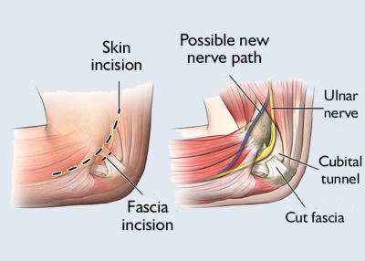 • Sometimes, the nerve is moved to a new position in front of the elbow (anterior transposition).